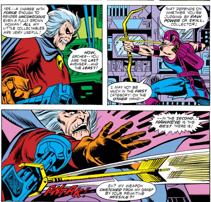 Another Stan Lee tradition carried on, here, was an emphasis on characterization. There's a huge cast of characters, which makes keeping personalities distinct a challenge for the writers. Some characters were little more than extras on the set, like Hawkeye, Hercules, Black Panther and Yellowjacket to name just a few; but others are memorable: Wonder Man, Scarlet Witch, Iron Man and Captain America stand out. Even Korvac and his wife are sympathetic.