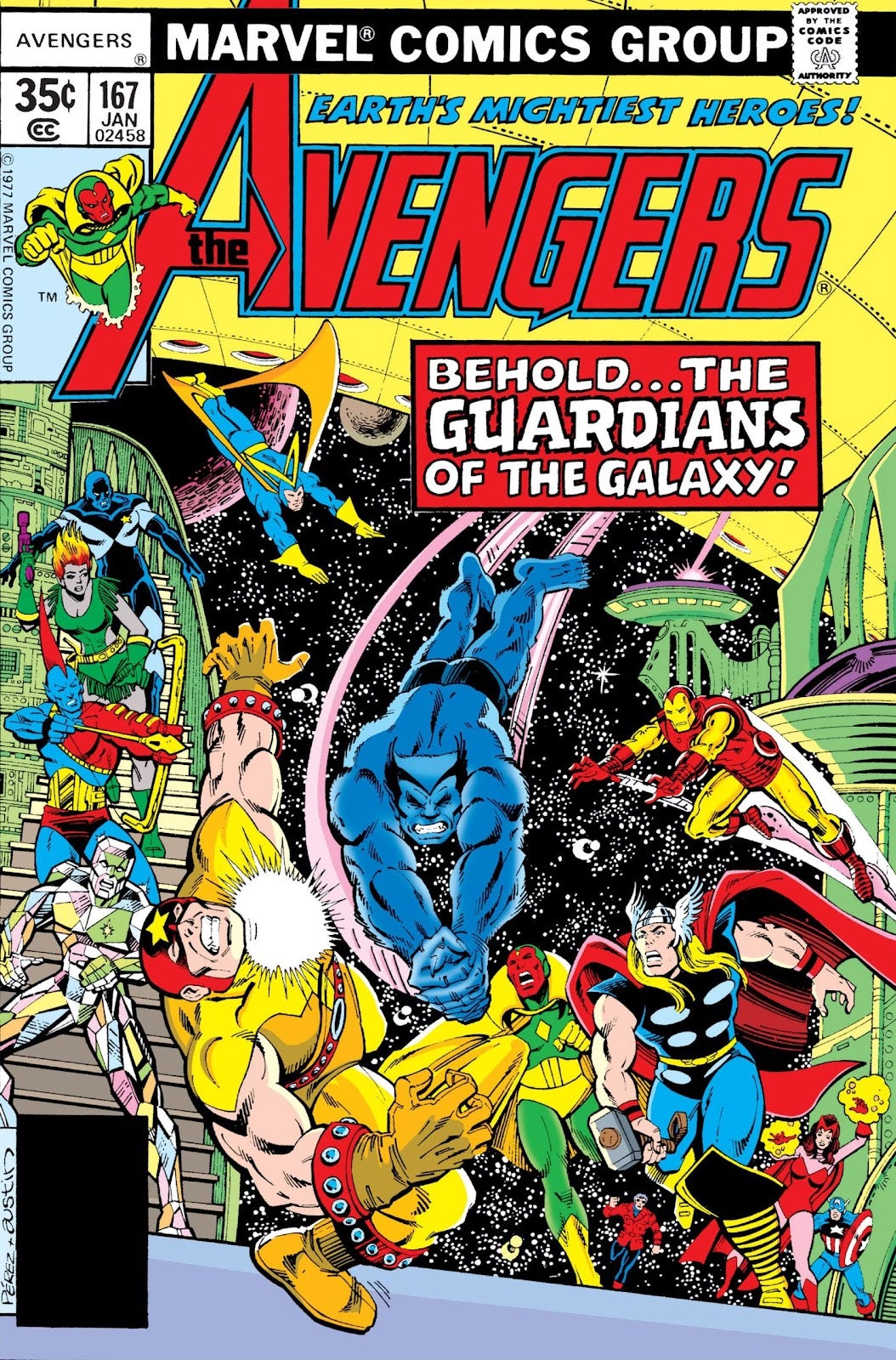 The Avengers enter the mysterious space structure and encounter the Guardians of the Galaxy, who inform them that Korvac (formerly "the Machine Man") is building a galactic empire across time and space. As part of his agenda, the Guardians believe Korvac plans to go back in time to assassinate Vance Astro as a child. And without Vance Astro, there will be no Guardians of the Galaxy, meaning Korvac can rule unopposed in an alternate future.