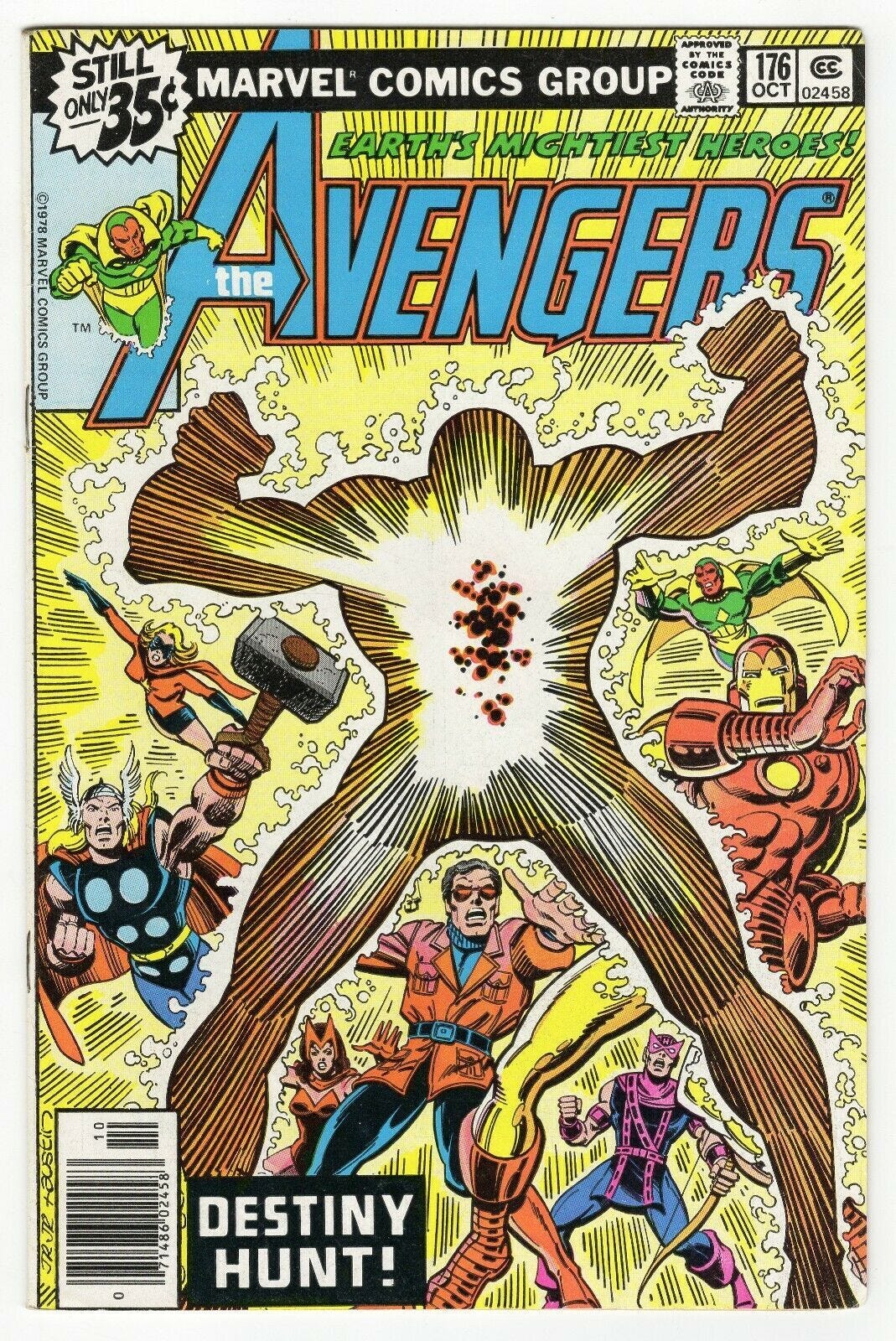 On their way to the cosmic showdown, heroes clash with villains and each other. In one of the subplots, Special Agent Gyrich from the National Security Council revokes the Avengers' security clearances, confiscates their Quinjet and other assets. That's gonna make matters interesting. And humorous: at one point the Avengers assemble to respond to a threat...and have to take a city bus to get on site. In another, Korvac, in the guise of a human named Michael, takes up residence in Forest Hills Gardens and acquires a bride who just happens to be the daughter of The Collector. Yet another subplot sees Starhawk obliterated, resurrected, then rendered blind to Korvac's presence...and even existence.