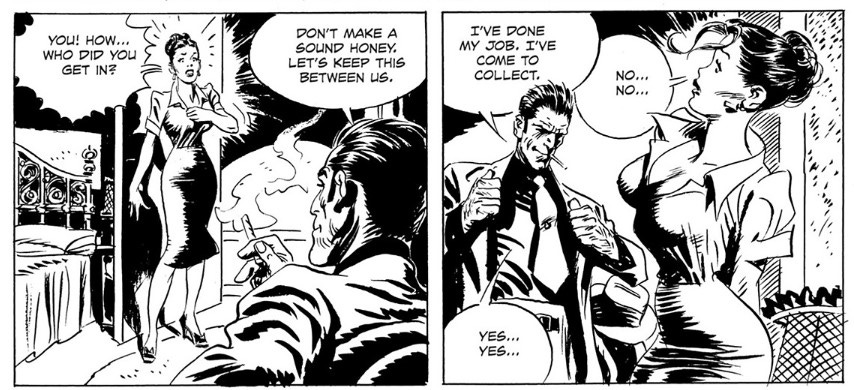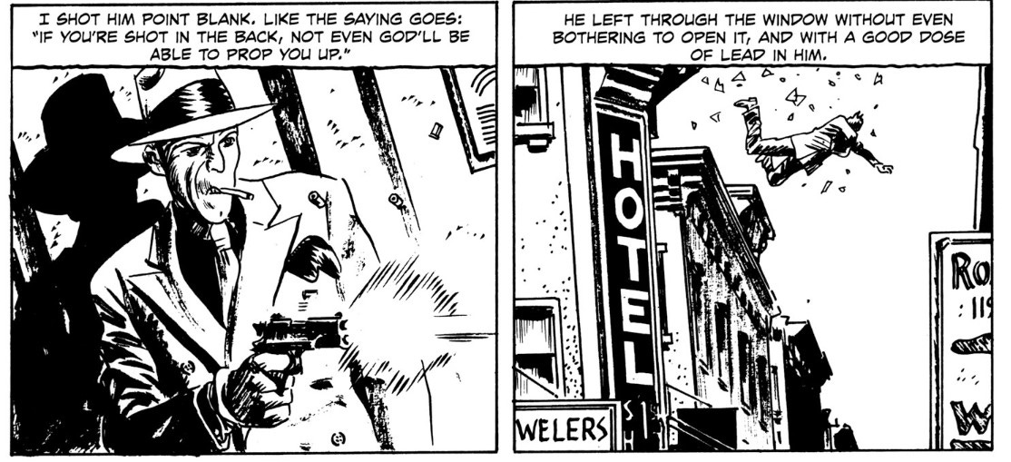 But with the exception of the book cover(s), Torpedo stories should never be colored. They were intended to be black & white, like the classic Warner Brothers gangster flicks. Anything more lush than the stark contrast in these panels would ruin them.