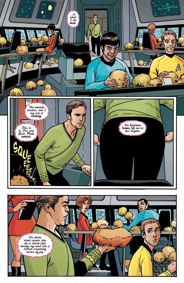 Enter comedian and actor Patton Oswalt, who’s made waves in culture recently by working for Heather Antos IDW Star Trek comics, writing a bizarre piece of fan fiction where a tribble fetishizes Captain Kirk in the most disturbing manners.