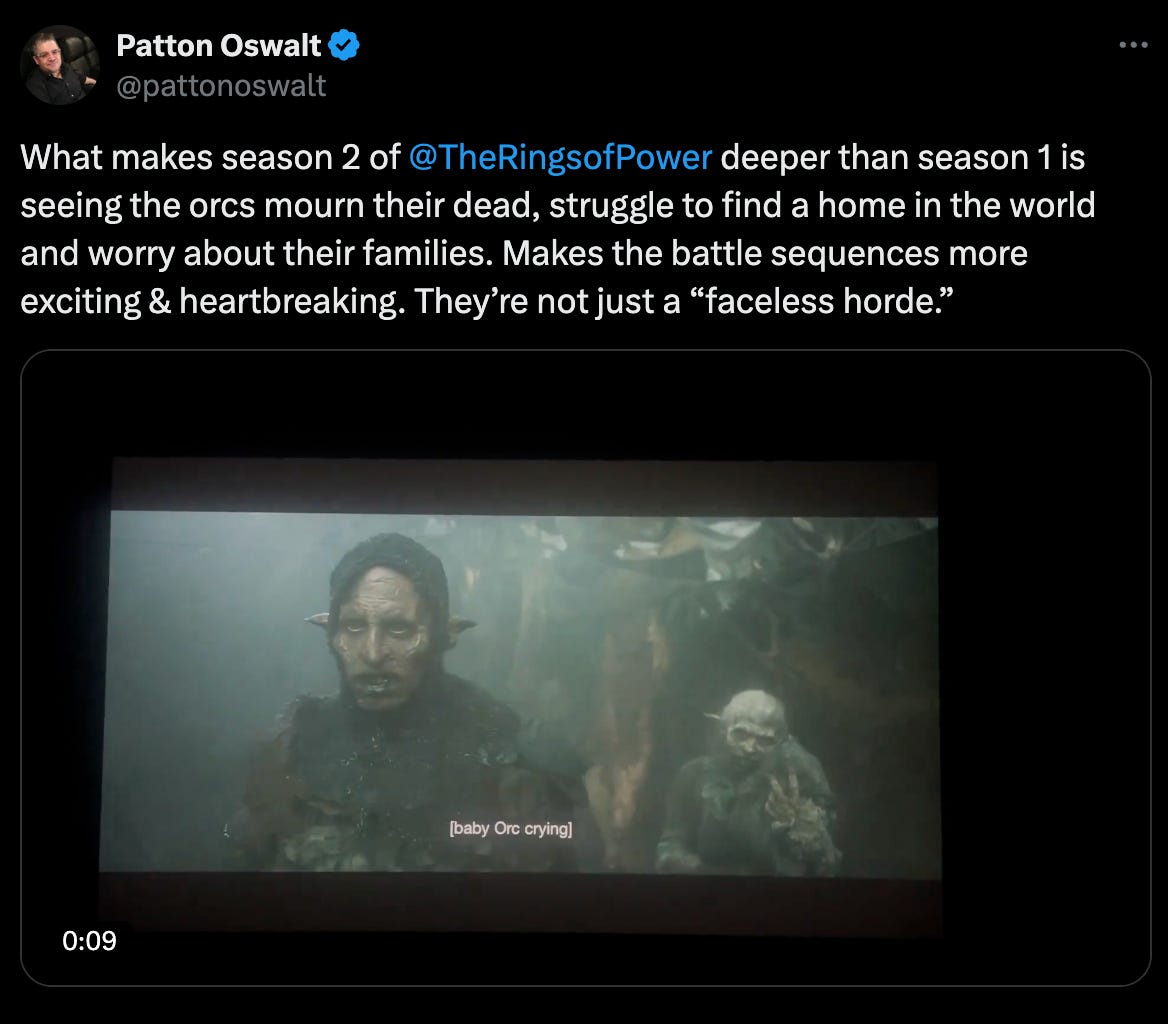Now, Oswalt is making a more disturbing comment about Rings of Power, praising the writing team for humanizing Orcs. He posted to X, What makes season 2 of