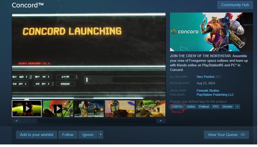 This week has been a disaster for woke games. The Sweet Baby Inc. flagship Dustborn launched to almost zero players on Steam. Concord, which was advertised heavily as LGBTQ+ inclusive as an Overwatch replacement, launched similarly, with less than 700 players on the online-only game at its peak.