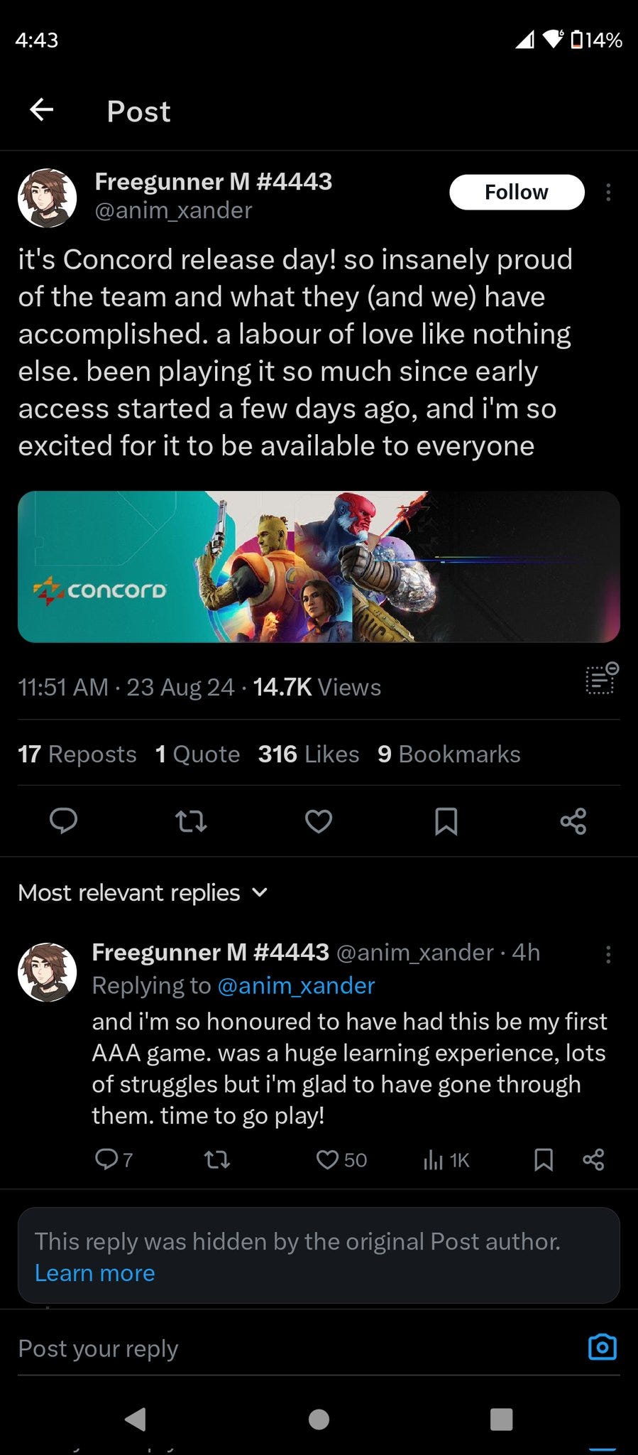 X user Anim_xander posted about the game, saying, “it’s Concord release day! so insanely proud of the team and what they (and we) have accomplished. a labour of love like nothing else. been playing it so much since early access started a few days ago, and i’m so excited for it to be available to everyone. and i’m so honoured to have had this be my first AAA game. was a huge learning experience, lots of struggles but i’m glad to have gone through them. time to go play!”