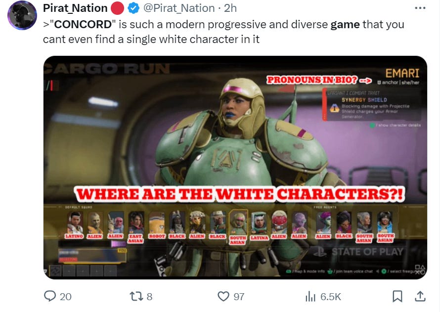 It’s easy to see why. Concord was early called out for its lack of white people in its “diverse” game. One gamer noted, “Concord is such a modern progressive and diverse game that you can’t even find a single white character in it.”