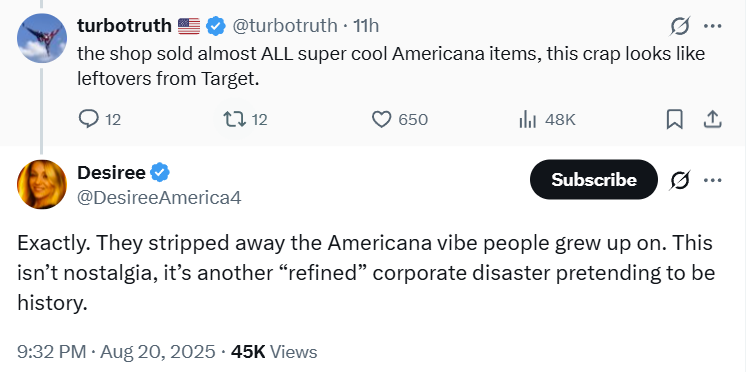 She added, “They stripped away the Americana vibe people grew up on. This isn’t nostalgia, it’s another ‘refined’ corporate disaster pretending to be history.”
