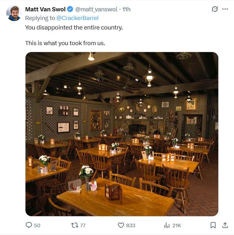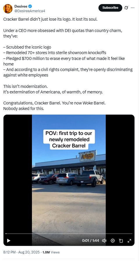 DesireeAmerica4 wrote, “Cracker Barrel didn’t just lose its logo. It lost its soul. Under a CEO more obsessed with DEI quotas than country charm, they’ve: – Scrubbed the iconic logo – Remodeled 70+ stores into sterile showroom knockoffs – Pledged $700 million to erase every trace of what made it feel like home – And according to a civil rights complaint, they're openly discriminating against white employees This isn’t modernization. It’s extermination of Americana, of warmth, of memory. Congratulations, Cracker Barrel. You’re now Woke Barrel. Nobody asked for this.”