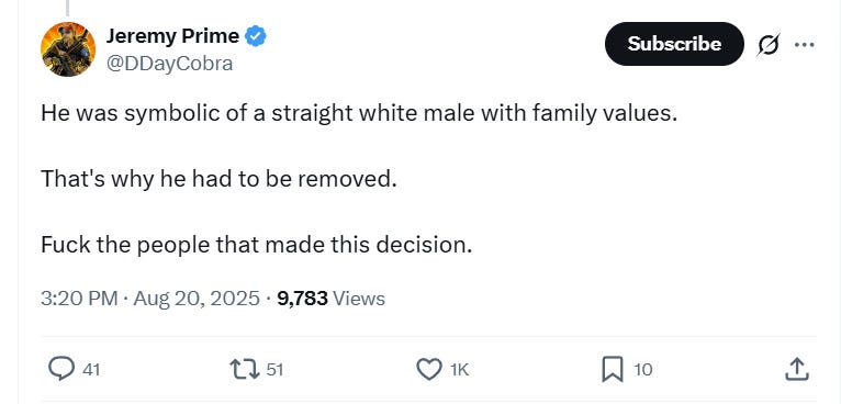 Political and culture commentator Jeremy Griggs aka DDayCobra wrote, “He was symbolic of a straight white male with family values. That's why he had to be removed. F**k the people that made this decision.”