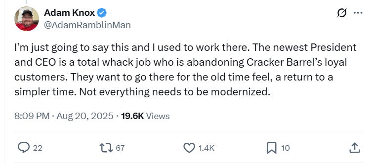 Adam Knox, who claims to be a former employee, wrote, “I’m just going to say this and I used to work there. The newest President and CEO is a total whack job who is abandoning Cracker Barrel’s loyal customers. They want to go there for the old time feel, a return to a simpler time. Not everything needs to be modernized.”