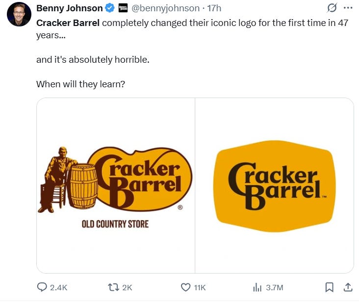 Benny Johnson simply wrote, “Cracker Barrel completely changed their iconic logo for the first time in 47 years... and it's absolutely horrible. When will they learn?”
