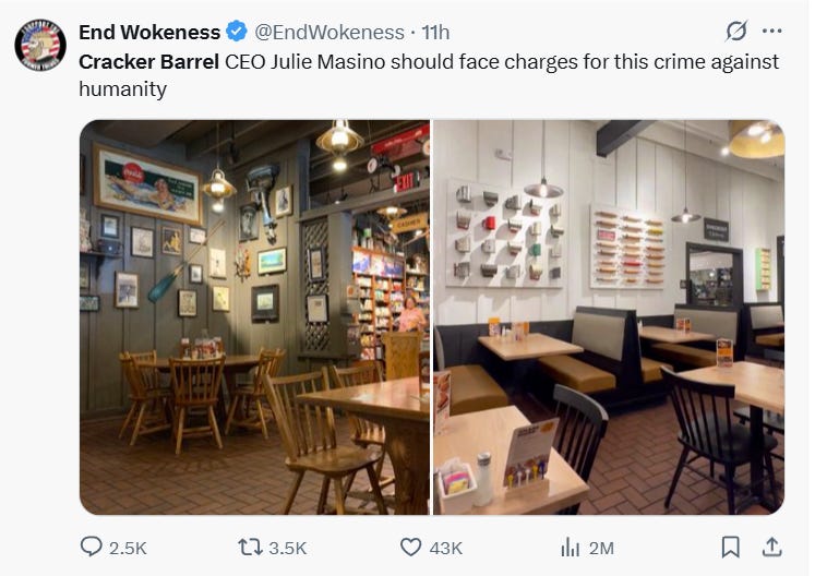 End Wokeness wrote, “Cracker Barrel CEO Julie Masino should face charges for this crime against humanity.”