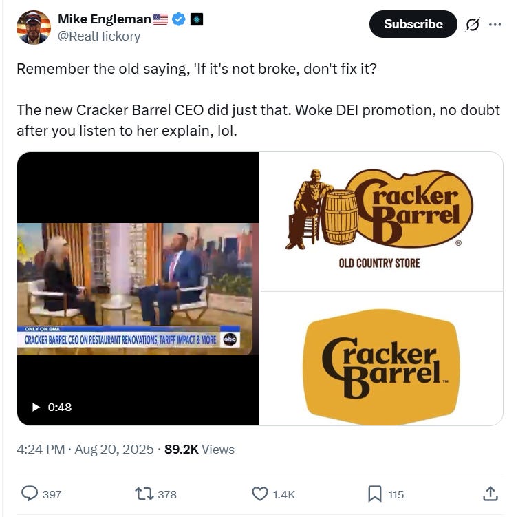 Mike Engleman wrote, “Remember the old saying, 'If it's not broke, don't fix it? The new Cracker Barrel CEO did just that. Woke DEI promotion, no doubt after you listen to her explain, lol.”