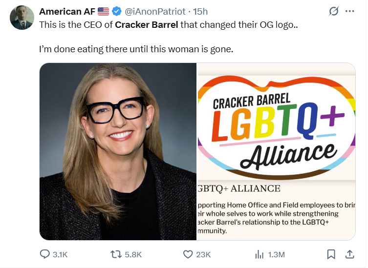 iAnonPatriot announced he’s boycotting the restaurant until Masino is removed as CEO, “This is the CEO of Cracker Barrel that changed their OG logo.. I’m done eating there until this woman is gone.”