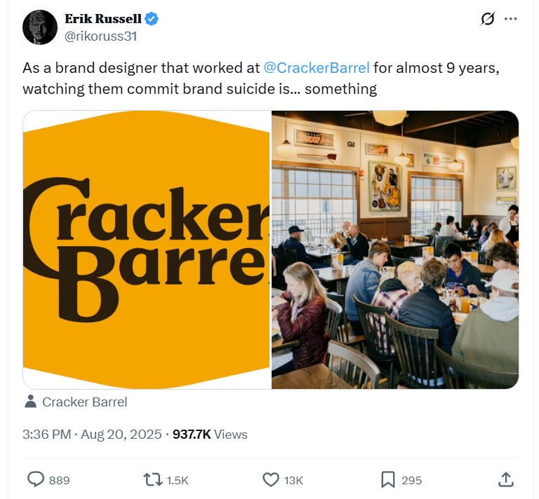 Erik Russell, who also claims to be a former Cracker Barrel employee and brand designer, stated, “As a brand designer that worked at Cracker Barrel for almost 9 years, watching them commit brand suicide is... something.”