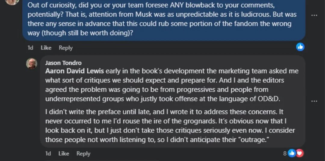 As we reported, Tondro’s foreword warned readers that the original D&D materials contained “a virtual catalog of insensitive and derogatory language” and framed specific creative choices by Gygax as deliberate misogyny. When the backlash came, rather than engage with the criticism, Tondro dismissed the entire upset fanbase. “Early in the book’s development the marketing team asked me what sort of critiques we should expect and prepare for,” he wrote in a Facebook post that later circulated widely. “And I and the editors agreed the problem was going to be from progressives and people from underrepresented groups who justly took offense at the language of original D&D.” He followed that by saying he considered the grognards “not worth listening to” and had not anticipated their outrage.