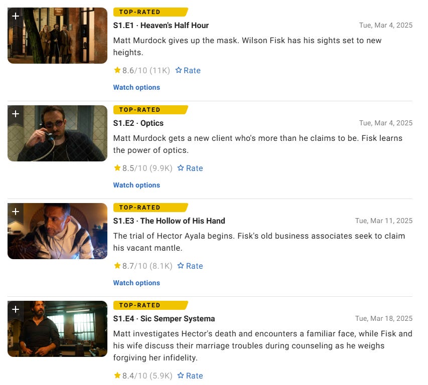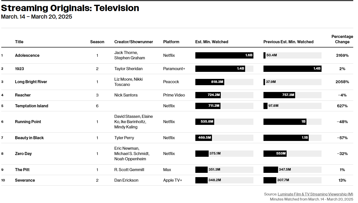 Of note, Luminate typically tracks from the end of the week to the end of the week and Daredevil: Born Again releases on Tuesdays so the first weekend of an episode’s release is not included in the data set until the following week. That’s why the show charted and had more viewership in its second week than in its premiere week.