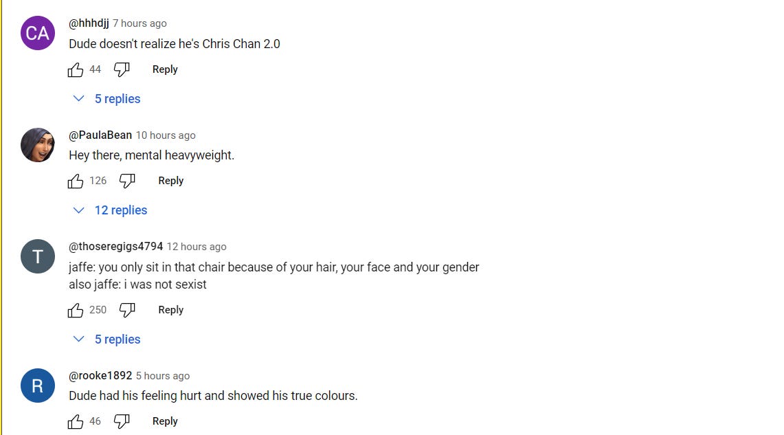 “Jaffe: you only sit in that chair because of your hair, your face and your gender. Also Jaffe: I was not sexist.,” wrote another.