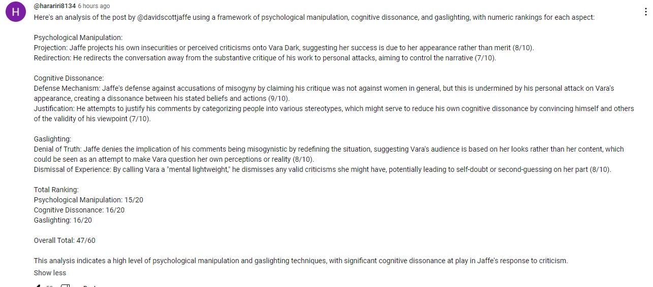 The user concluded, “This analysis indicates a high level of psychological manipulation and gaslighting techniques, with significant cognitive dissonance at play in Jaffe’s response to criticism.”