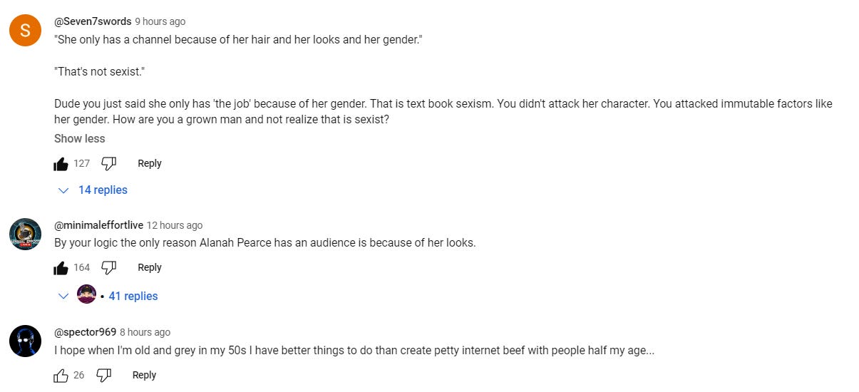 Youtuber Minimal Effort Live and a contributor to Fandom Pulse wrote, “By your logic the only reason Alanah Pearce has an audience is because of her looks.”