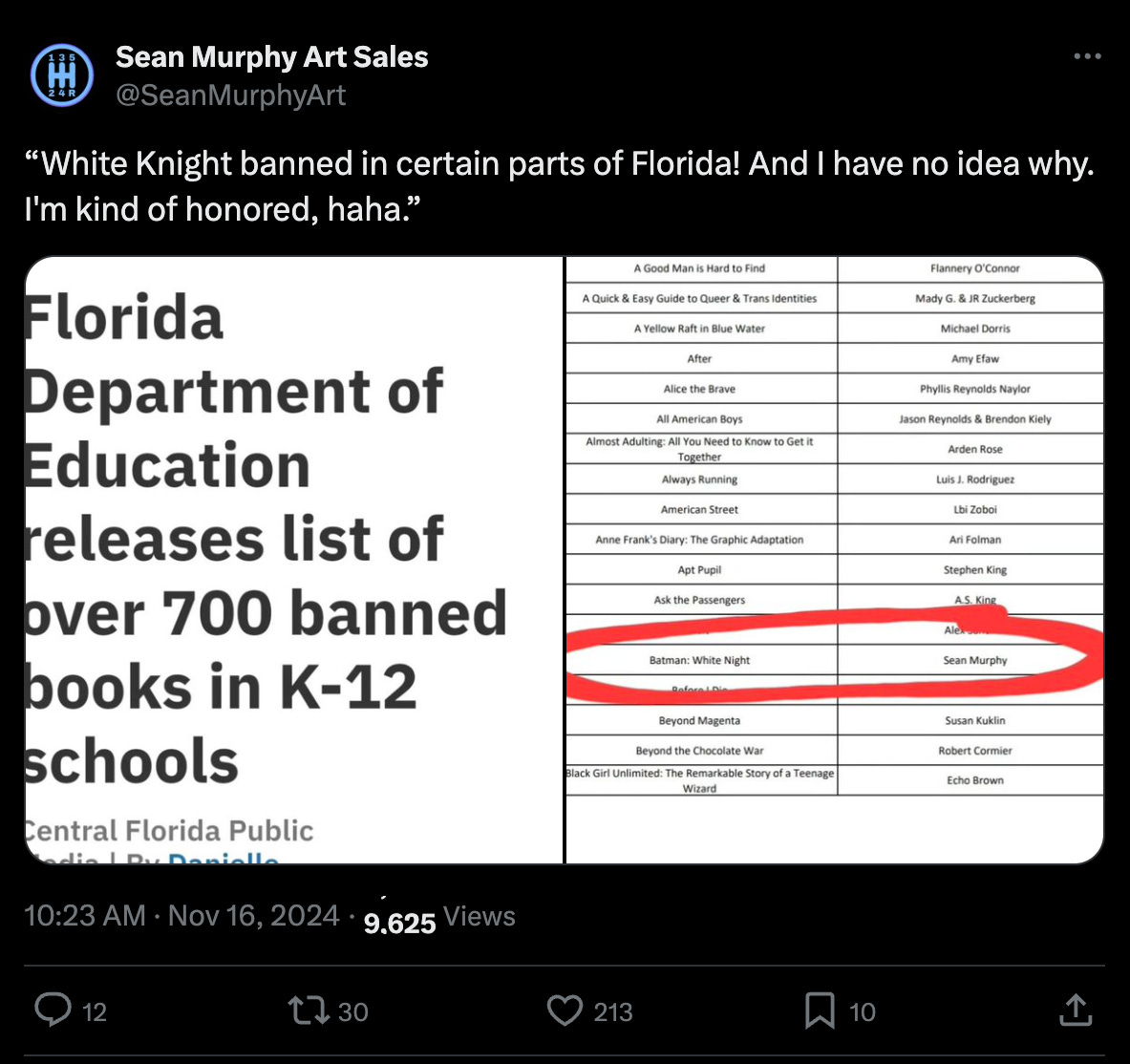 Posting to X on an account he claims is managed by an art sales rep, Sean Gordon Murphy is quoted saying, “White Knight banned in certain parts of Florida! And I have no idea why. I'm kind of honored, haha.”