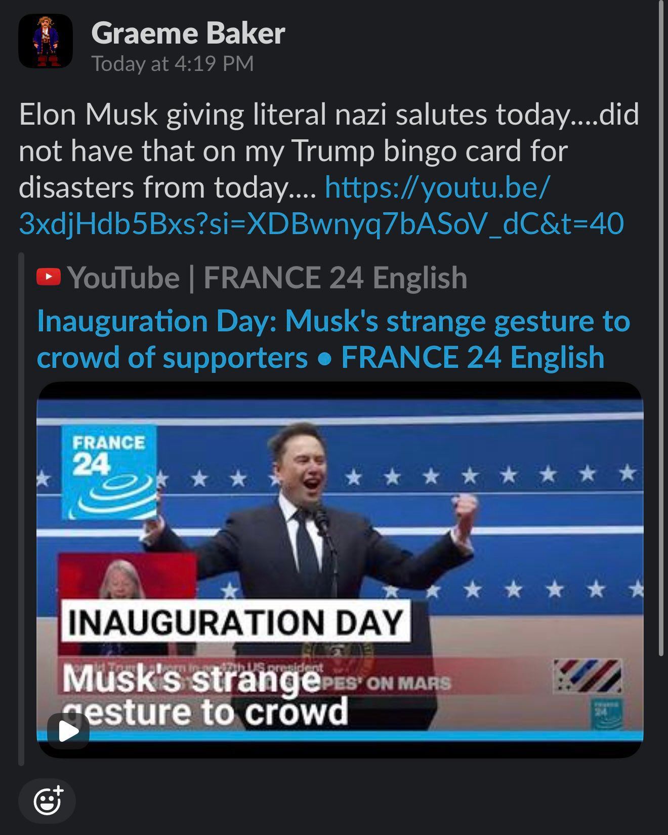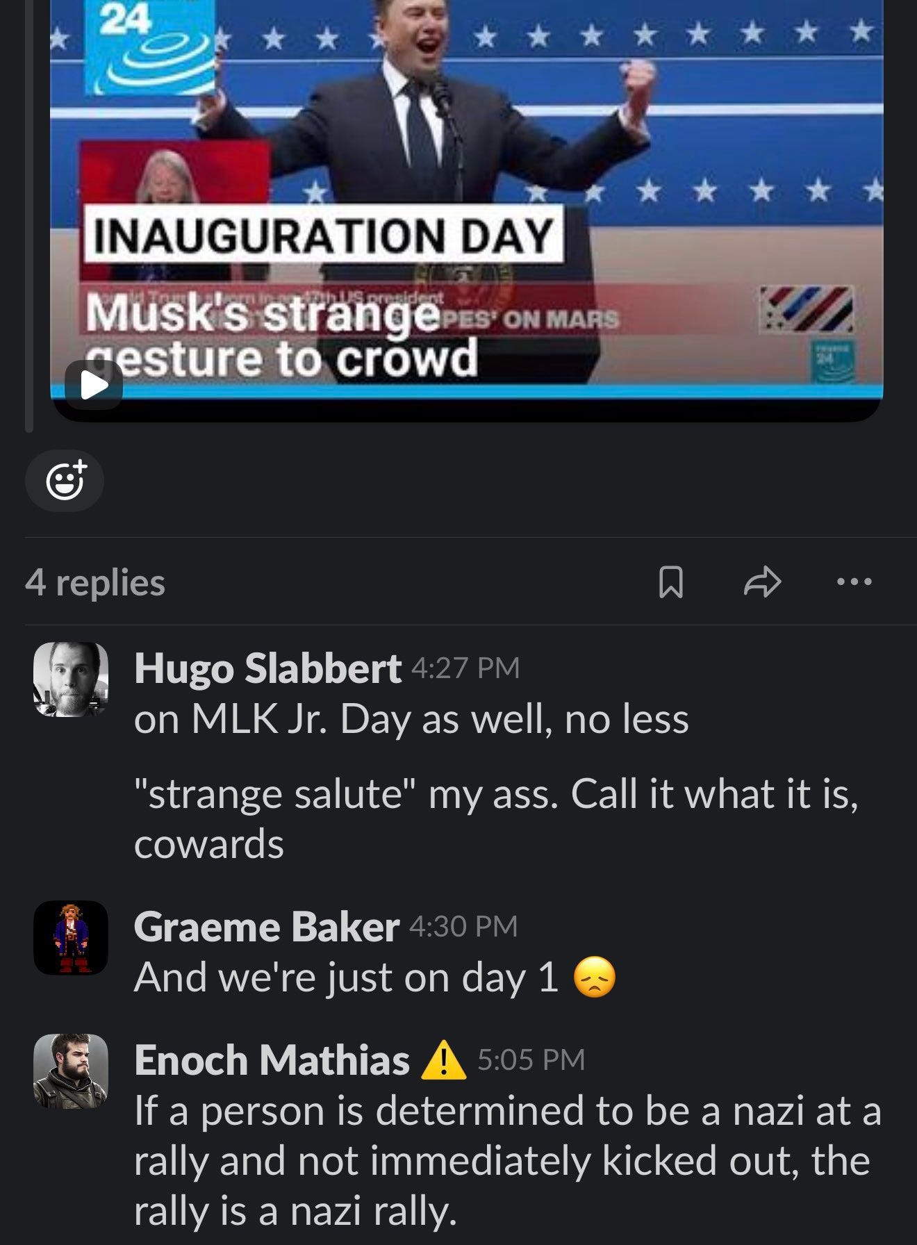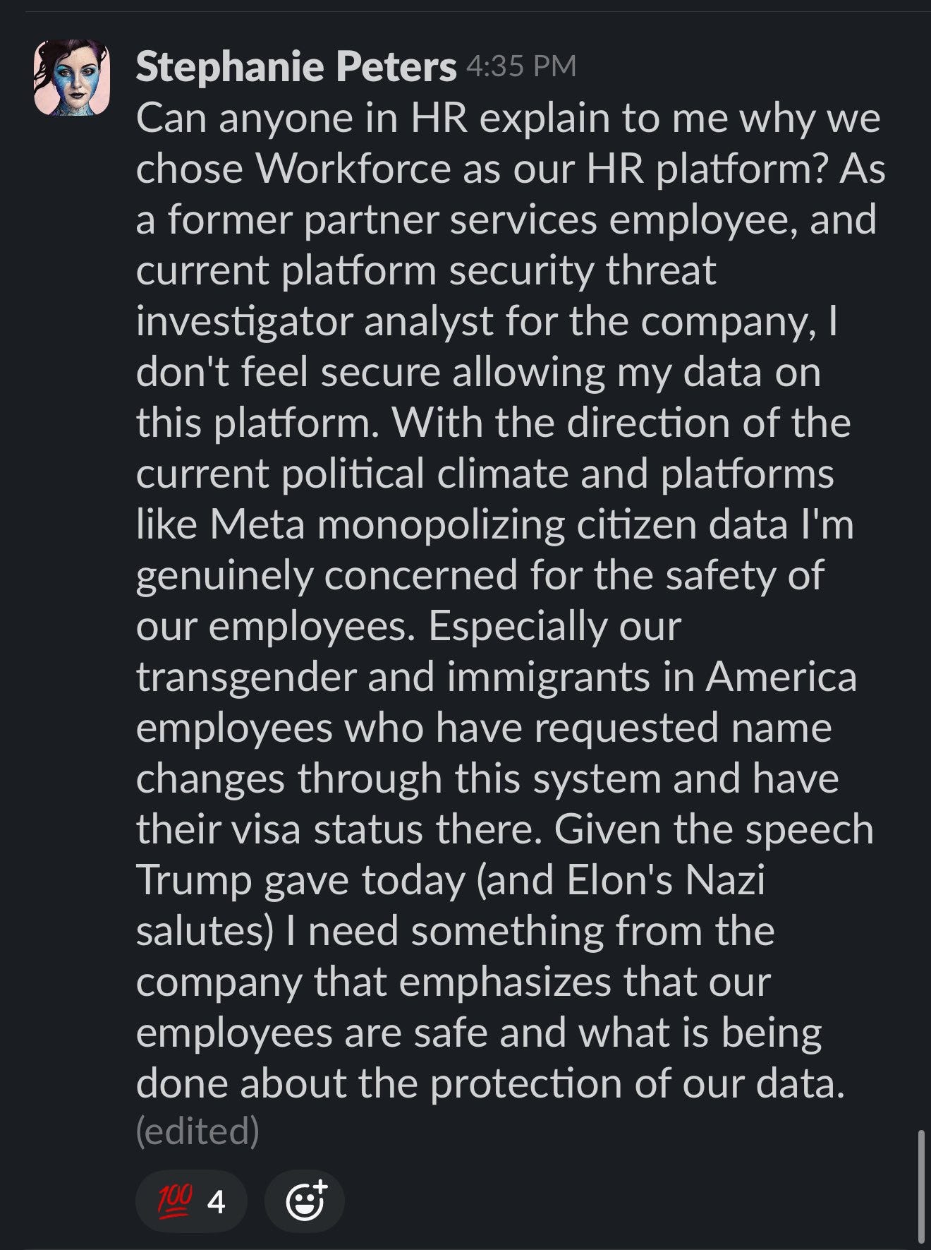 Peters added, “Given the speech Trump gave today (and Elon’s Nazi salutes) I need something from the company that emphasizes that our employees are safe and what is being done about the protection of our data.”