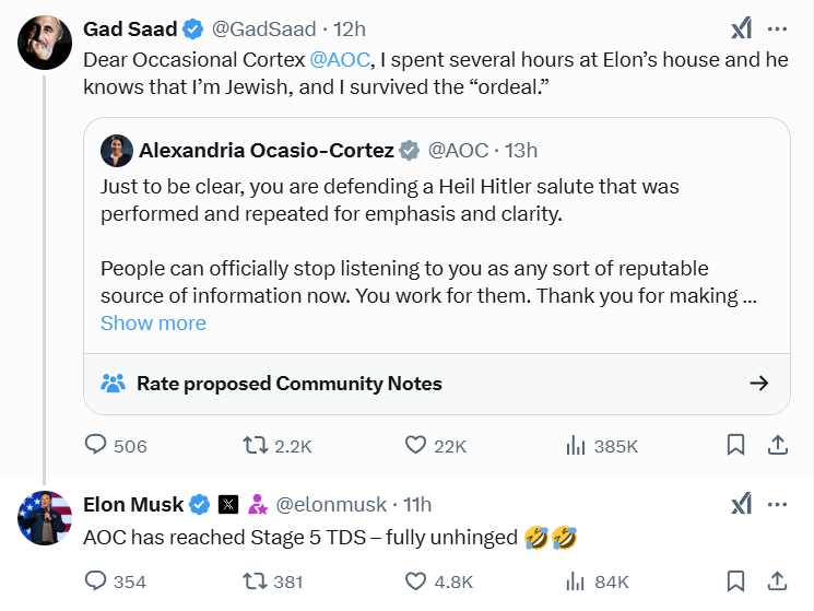 In a response to Gad Saad, he wrote, “AOC has reached Stage 5 TDS - fully unhinged.”