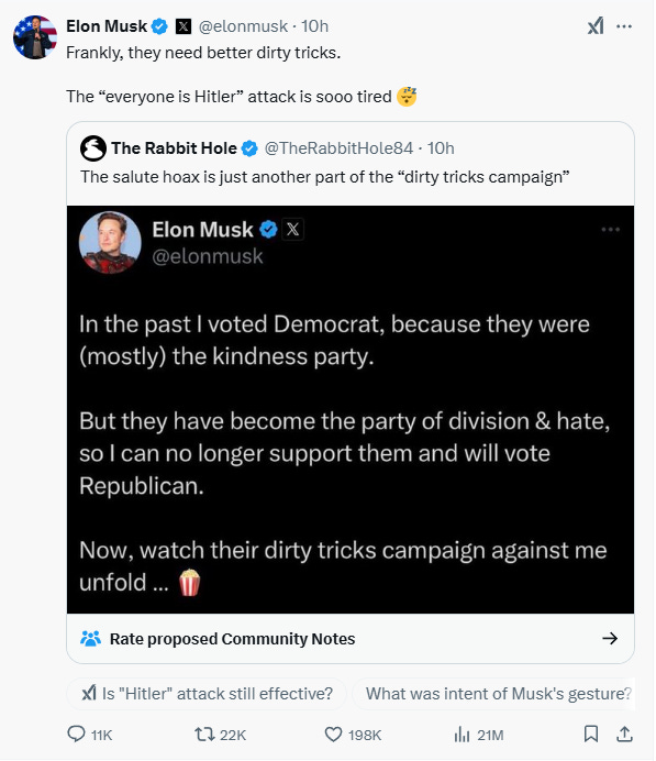 He wrote, “Frankly, they need better dirty tricks. The “everyone is Hitler” attack is sooo tired.”