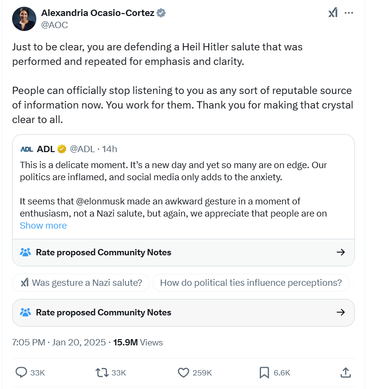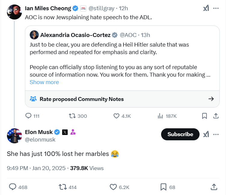 While Musk did not respond to these individuals, he did respond to Ian Miles Cheong who shared similar comments from New York Representative Alexandria Ocasio-Cortez. She wrote, “Just to be clear you are defending a Heil Hitler salute that was performed and repeated for emphasis and clarity. People can officially stop listening to you as any sort of reputable source of information now. You work for them. Thank you for making that crystal clear to all.”