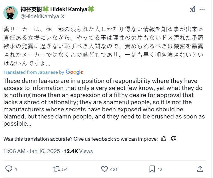 He concluded his thread writing, “These damn leakers are in a position of responsibility where they have access to information that only a very select few know, yet what they do is nothing more than an expression of a filthy desire for approval that lacks a shred of rationality; they are shameful people, so it is not the manufacturers whose secrets have been exposed who should be blamed, but these damn people, and they need to be crushed as soon as possible...”