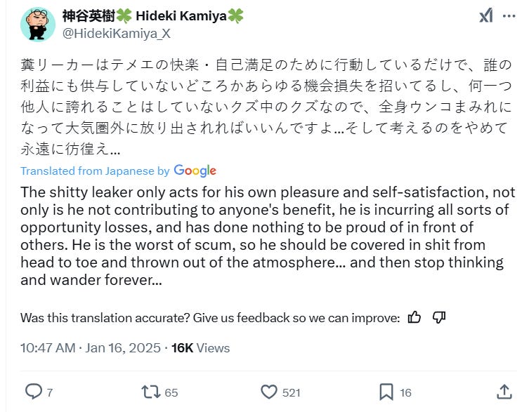 In a subsequent post, he wrote, “The s****y leaker only acts for his own pleasure and self-satisfaction, not only is he not contributing to anyone's benefit, he is incurring all sorts of opportunity losses, and has done nothing to be proud of in front of others.”