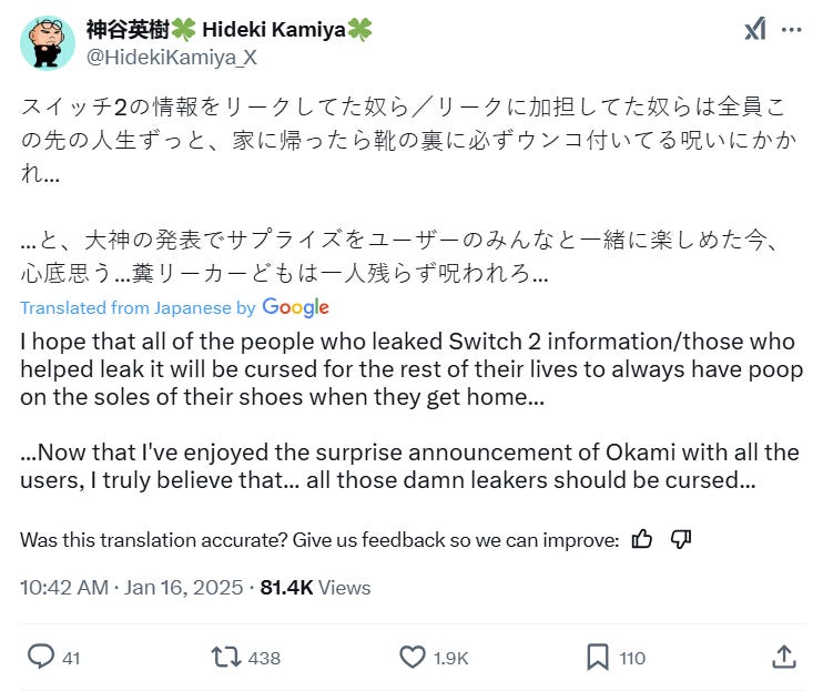 What do you make of Hideki Kamiya’s curse on the Nintendo Switch 2 leakers?
