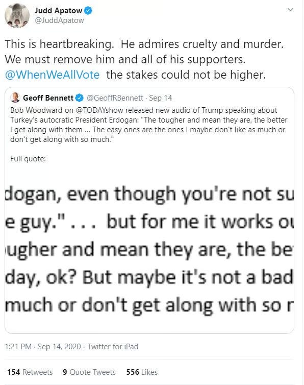 Apatow also wrote that Trump “admires cruelty and murder.”