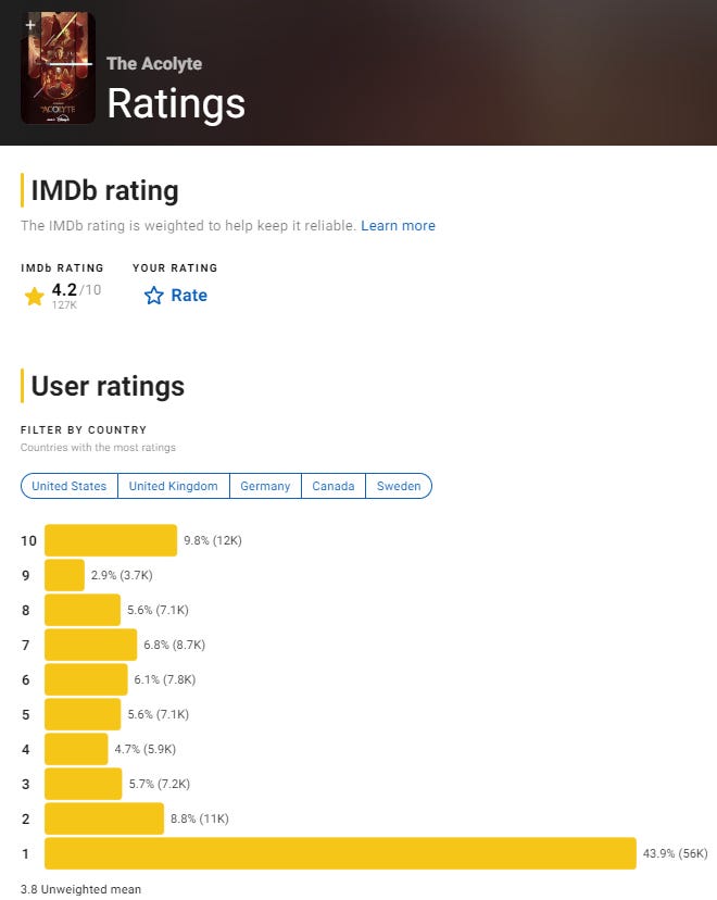 As for its viewership, The Acolyte and its two-episode premiere debuted on Nielsen’s Top 10 chart with just 488 million minutes viewed.