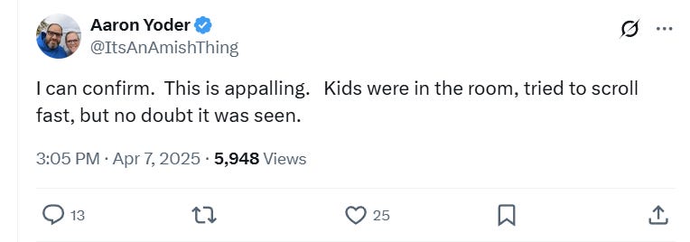 One wrote, “I can confirm. This is appalling. Kids were in the room, tried to scroll fast, but no doubt it was seen.”