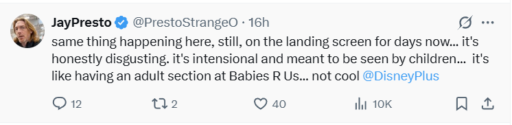 “same thing happening here, still, on the landing screen for days now... it's honestly disgusting. it's intensional and meant to be seen by children... it's like having an adult section at Babies R Us... not cool Disney+,” wrote JayPresto.