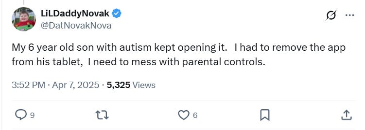 Another wrote, “My 6 year old son with autism kept opening it. I had to remove the app from his tablet, I need to mess with parental controls.”