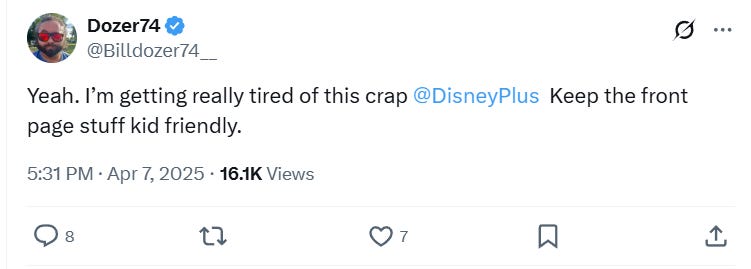 “Yeah. I’m getting really tired of this crap Disney+. Keep the front page stuff kid friendly,” Wrote Billdozer74__