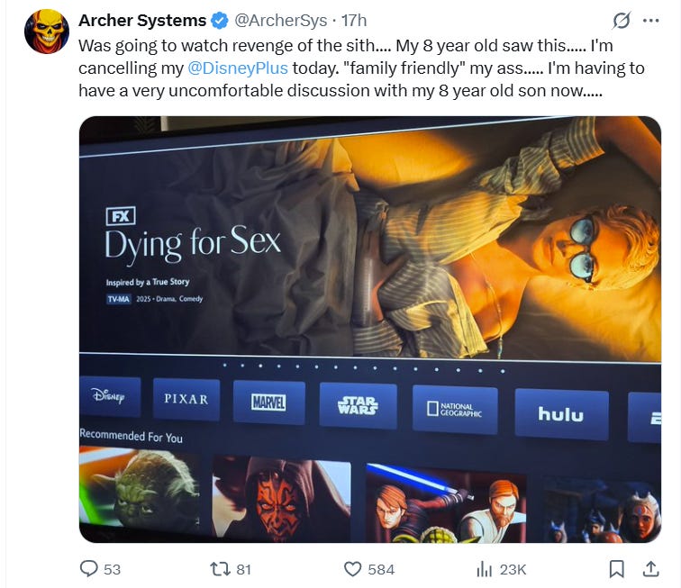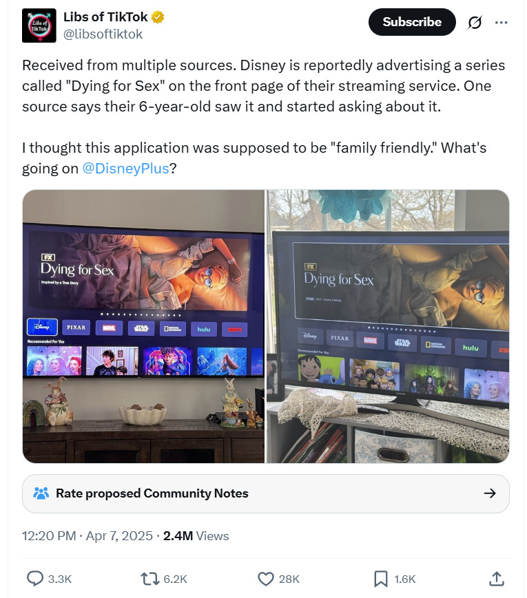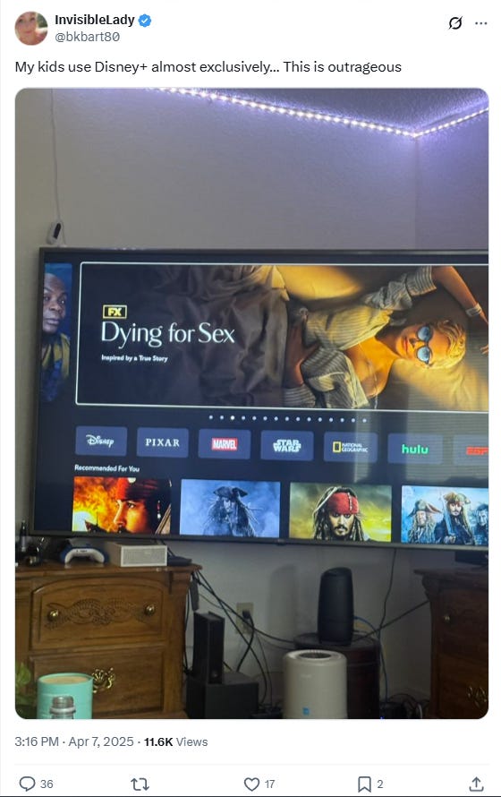 The show was recently advertised on the front of Disney+ with Michelle Williams in a hospital gown in a state of undress. According to Libs of TikTok who posted to X, “Received from multiple sources. Disney is reportedly advertising a series called Dying for Sex on the front page of their streaming service. One source says their 6-year-old saw it and started asking about it. I thought this application was supposed to be "family friendly." What's going on Disney+?”