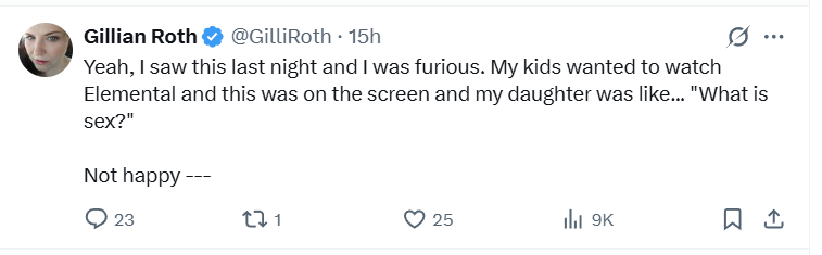 Gillian Roth wrote, “Yeah, I saw this last night and I was furious. My kids wanted to watch Elemental and this was on the screen and my daughter was like... ‘What is sex?’ Not happy ---”