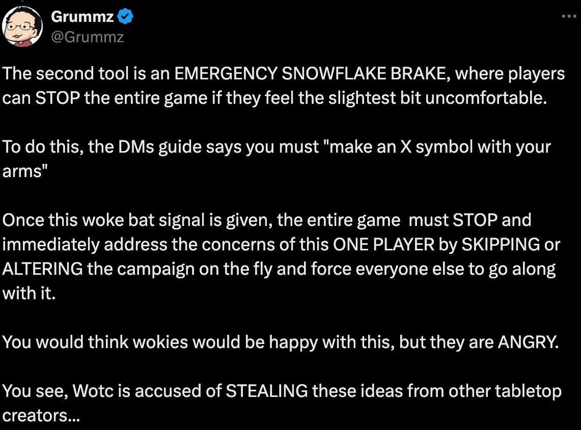 He posted to X, “The second tool is an EMERGENCY SNOWFLAKE BRAKE, where players can STOP the entire game if they feel the slightest bit uncomfortable. To do this, the DMs guide says you must ‘make an X symbol with your arms.’ Once this woke bat signal is given, the entire game must STOP and immediately address the concerns of this ONE PLAYER by SKIPPING or ALTERING the campaign on the fly and force everyone else to go along with it. You would think wokies would be happy with this, but they are ANGRY. You see, Wotc is accused of STEALING these ideas from other tabletop creators...”
