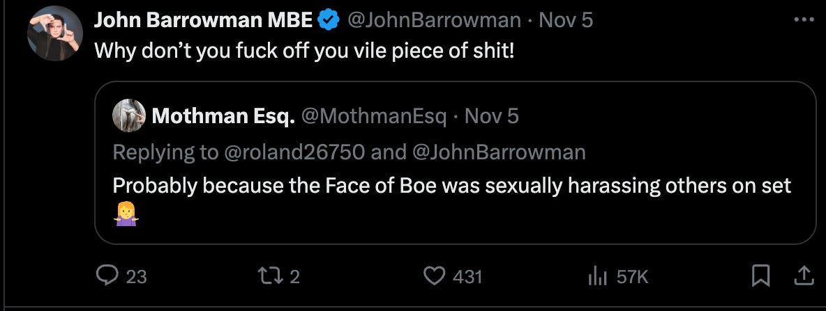 One fan directly accused him of sexual harassment, to which John Barrowman replied, “Why don’t you f*** off you vile piece of s***!”