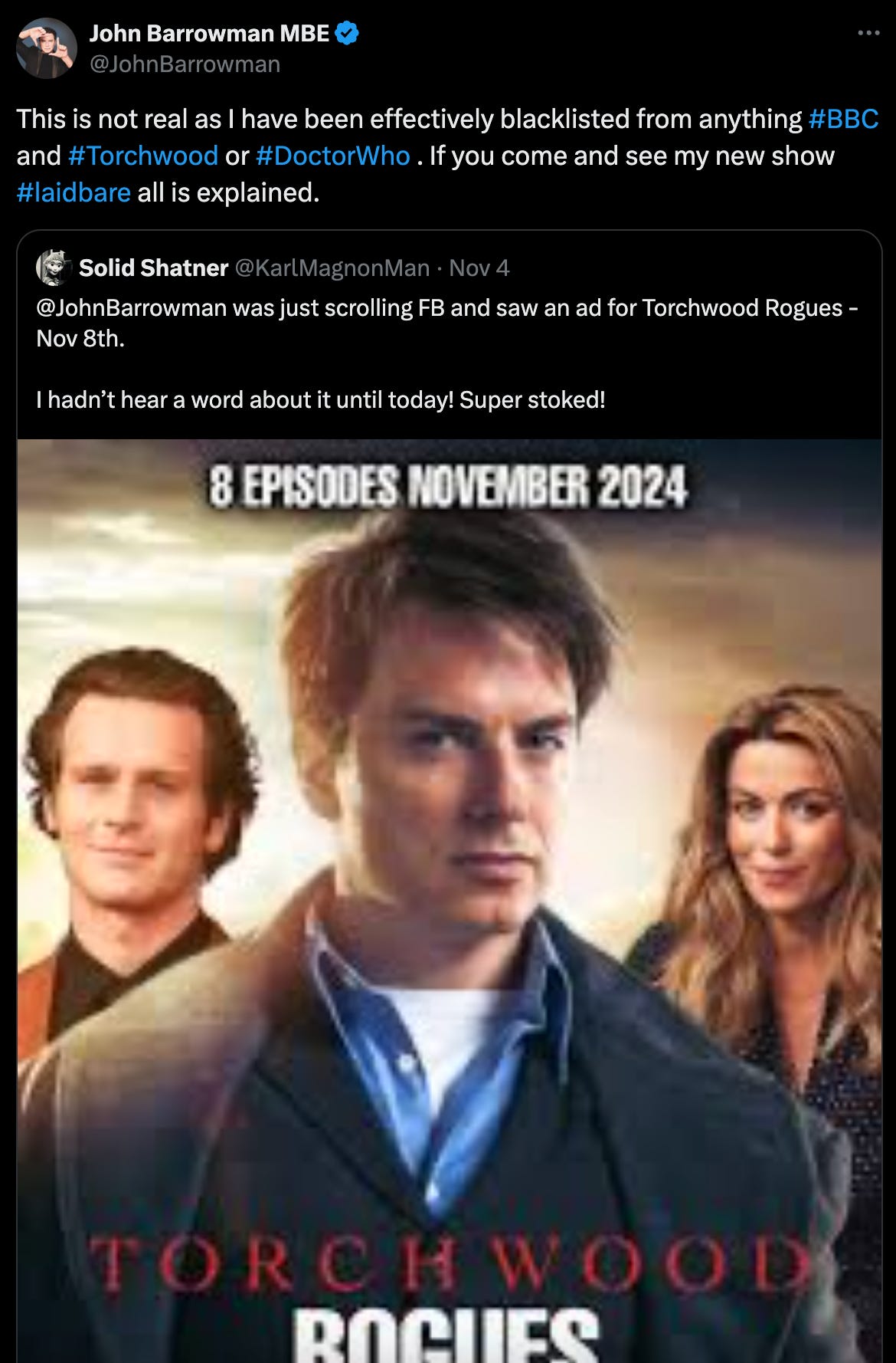 This prompted John Barrowman to respond and try to promote his new tour in the process, saying, “This is not real as I have been effectively blacklisted from anything #BBC and #Torchwood or #DoctorWho. If you come and see my new show #laidbare all is explained.”