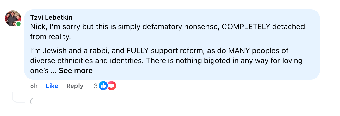 Doctor Who expert and commentator Tzvi Lebetkin, who runs the YouTube channel Rabbi From Another Planet, took exception to his post, saying, "Nick, I'm sorry but this is simply defamatory nonsense, COMPLETELY detached from reality. I'm Jewish and a rabbi, and FULLY support reform, as do MANY people of diverse ethnicities and identities."
