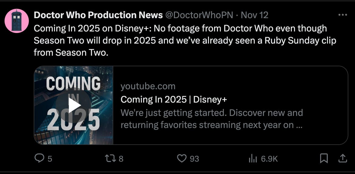 The X account Doctor Who Production News noted that Doctor Who is missing from the new trailer from Disney+ Coming in 2025. They posted, “Coming In 2025 on Disney+: No footage from Doctor Who even though Season Two will drop in 2025 and we’ve already seen a Ruby Sunday clip from Season Two.”