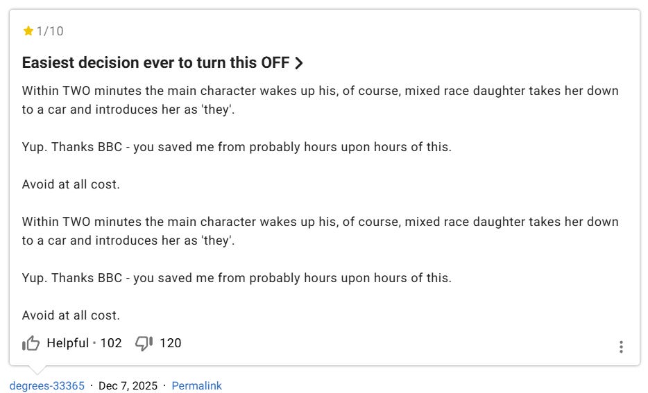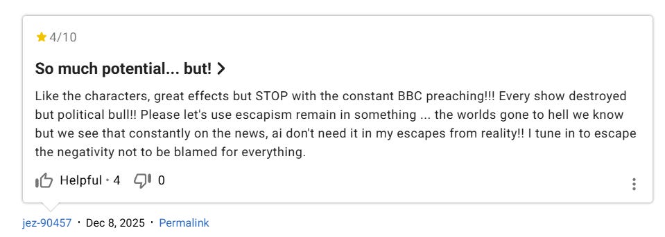 Another indicated how the show is constantly preaching woke ideology, “Like the characters, great effects but STOP with the constant BBC preaching!!! Every show destroyed but political bull!! Please let’s use escapism remain in something ... the worlds gone to hell we know but we see that constantly on the news, ai don’t need it in my escapes from reality!! I tune in to escape the negativity not to be blamed for everything.”