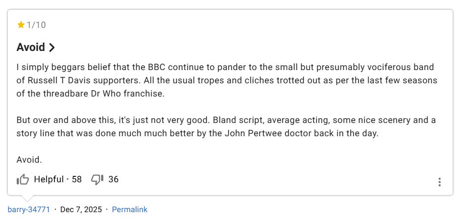 Another made a similar observation and recommended viewers avoid the show, “I simply beggars belief that the BBC continue to pander to the small but presumably vociferous band of Russell T Davis supporters. All the usual tropes and cliches trotted out as per the last few seasons of the threadbare Dr Who franchise. But over and above this, it’s just not very good. Bland script, average acting, some nice scenery and a story line that was done much much better by the John Pertwee doctor back in the day. Avoid.”