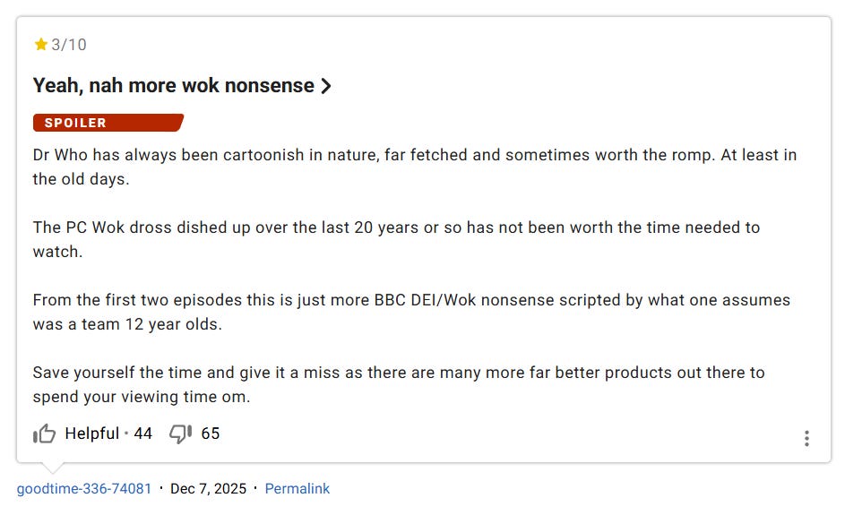 Another wrote, “Dr Who has always been cartoonish in nature, far fetched and sometimes worth the romp. At least in the old days. The PC Wok dross dished up over the last 20 years or so has not been worth the time needed to watch. From the first two episodes this is just more BBC DEI/Wok nonsense scripted by what one assumes was a team 12 year olds. Save yourself the time and give it a miss as there are many more far better products out there to spend your viewing time om.”