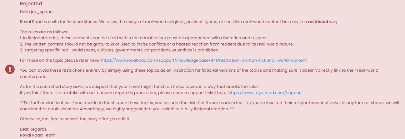 Under the rules stated, nearly every story that ever has or will be set in the real world could be logically decided to break the rules. But was this the reason why I was being flagged?