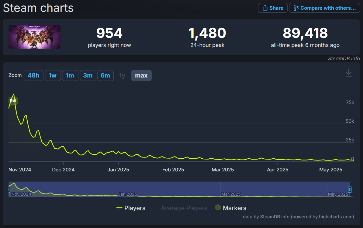 Furthermore, its peak concurrent players was less than half of what BioWare’s Dragon Age: The Veilguard achieved in its first day, which was 70,414. It would eventually hit an all-time peak of 89,418.