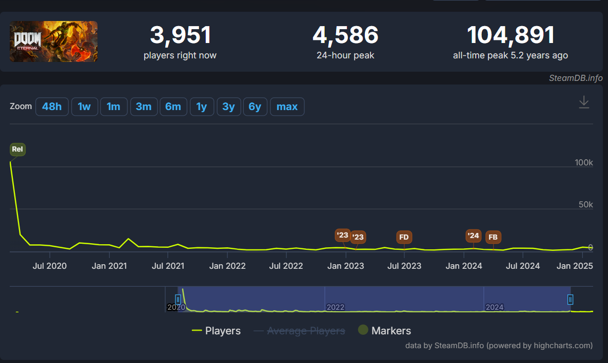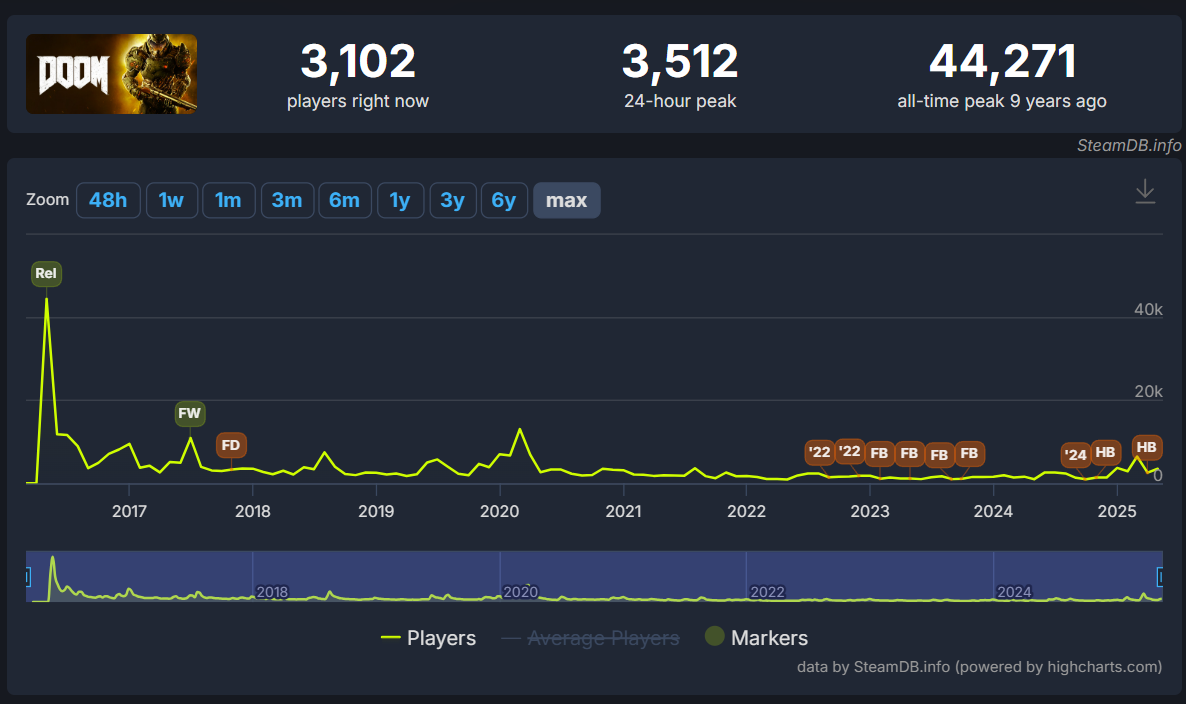 Even the 2016 Doom title hit a higher peak on its release date. It hit a peak concurrent player count of 44,271.